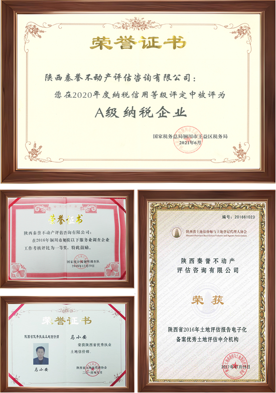 本公司技术力量雄厚,实践经验丰富,执业水平受到相关政府部门及委托单位的好评。已被陕西省高级人民法院选任为委托评估机构,已入围多家金融机构。2014年被陕西省土地估价师协会评为优秀土地评估机构,估价师马小安、周巧云荣获陕西省优秀估价师称号;2015年-2016年连续两年被国家统计局铜川调查队工作考核评比为一等奖;2016年陕西省土地评估报告电子化备案优秀土地评估中介机构;2020年获得年度A级纳税企业。