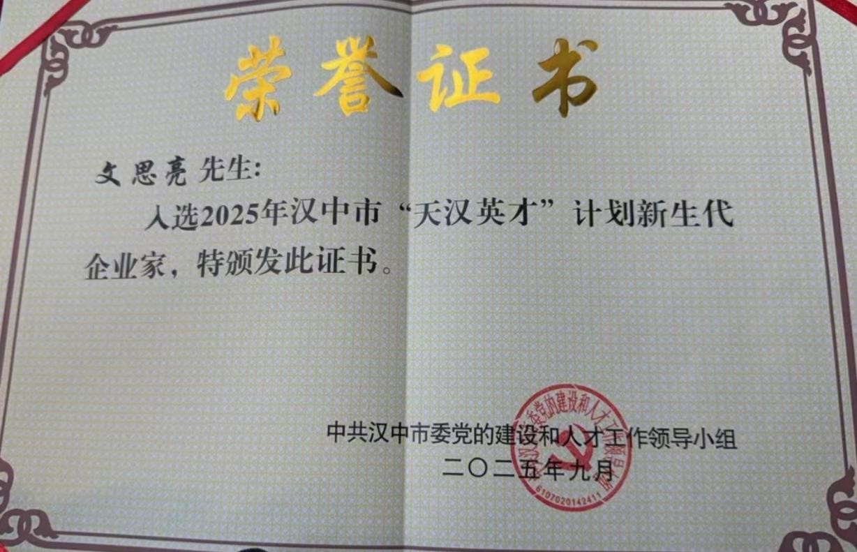 公司董事长文思亮于2025年9月入选2025年汉中市“天汉英才”计划新生代企业家。
